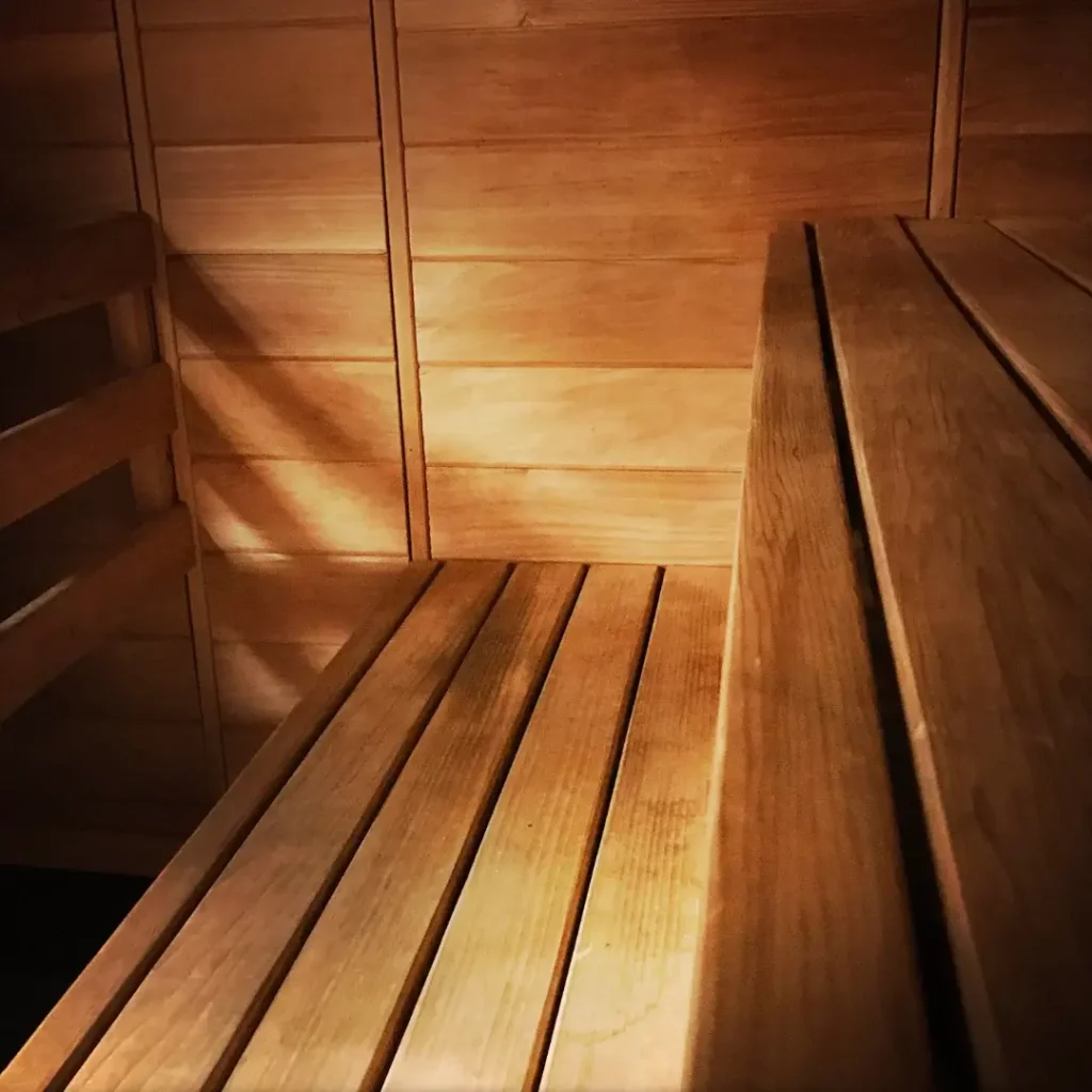 Drewniane ławy umieszczone na różnych wysokościach, zapewniające wygodę i możliwość dostosowania temperatury. Oświetlenie jest delikatne, tworząc przyjemną atmosferę.